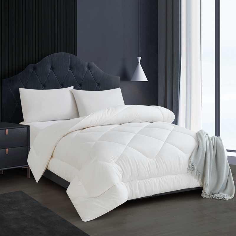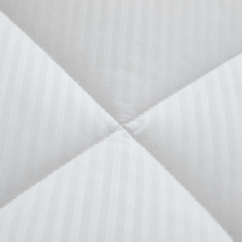 Táto prikrývka z mikrovlákna, navrhnutá špeciálne pre hotelové izby, obsahuje prémiovú bavlnu a mäkkú hrejivú výplň z mikrovlákna. Dostupné vo veľkostiach od twin po king, kombinuje prémiovú bavlnu s výplňou z mikrovlákna. Bavlna je priedušná a mäkká na dotyk, zatiaľ čo výplň z mikrovlákna je ľahká a hrejivá a poskytuje vynikajúce teplo bez objemu. Jeho jemné vlákna zachytávajú vzduch a vytvárajú vankúšovitý efekt. Prikrývka má počet nití 233/300 TC (k dispozícii sú vlastné možnosti), čo je kľúčový ukazovateľ kvality a odolnosti látky. Vyšší počet nití znamená, že bavlnené vlákna sú tkané pevnejšie, čím sa zvyšuje pevnosť a mäkkosť látky.